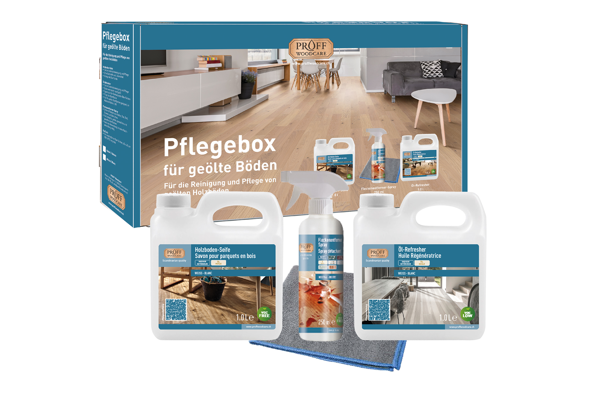 - Pflegebox mit 1 x 1 Liter Holzboden-Seife, 1 x 1 Liter Öl-Refresher, 1 x 250ml Fleckenspray und 1x Eco-Tuch
